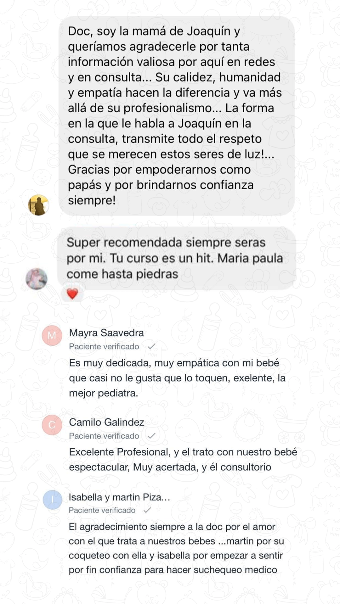 “Haber hecho el curso de alimentación complementaria de la Dra. Natalia ha sido la mejor decisión que he tomado. Gracias por todo tu conocimiento, ha sido muy valioso, ha sido una guía fundamental en este proceso tan hermoso con Matías. Dios te bendiga.”