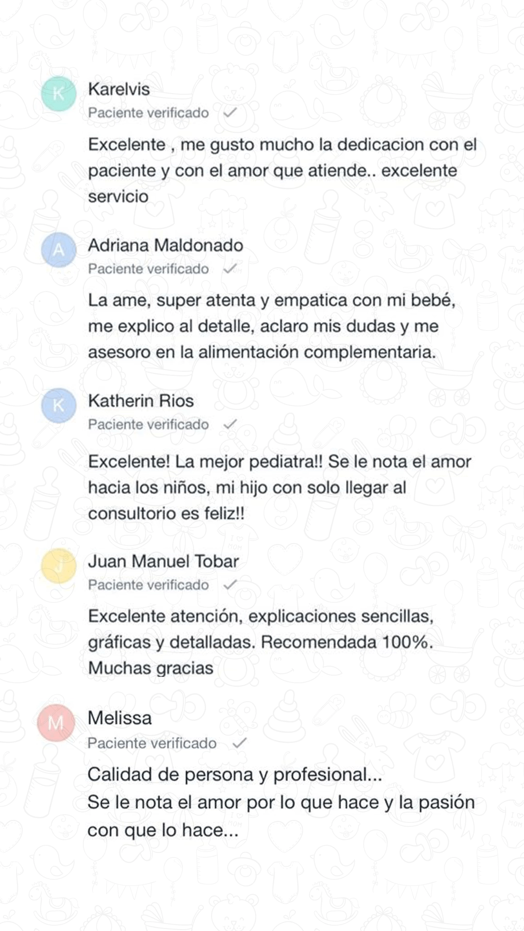 “Siempre pendiente, respetuosa, empática y acertada con la salud y las emociones de mi hijo. Amo cada vez que se dirige a él y lo tienen cuenta como la personita que es.”